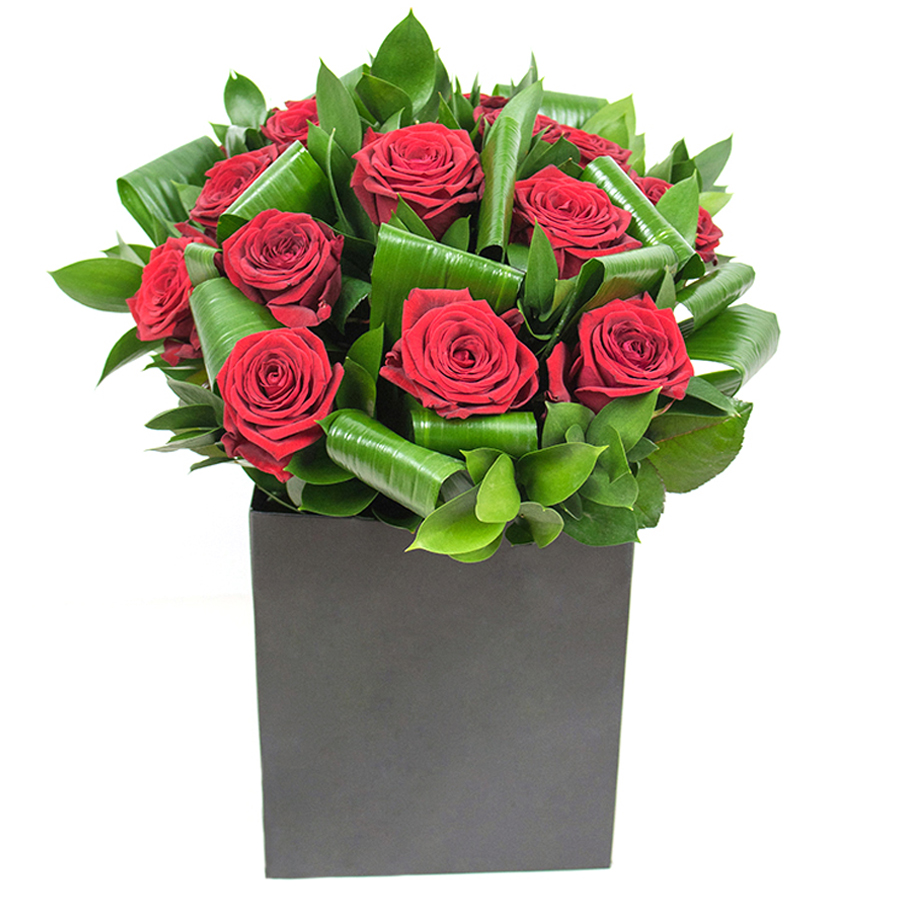 Our graceful bouquet combines stunning red roses with lush aspidistra leaves and delicate ruscus, creating a unique and elegant floral arrangement that enhances any decor.